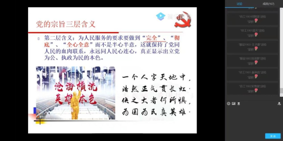 4月10日晚7点,建筑工程学院、纺织服装学院全体165名入党积极分子齐聚线上共上一堂党课。建筑工程学院梁桥书记以“党的宗旨和党的作风”为题为建筑工程学院和纺织服装学院的全体入党积极分子在线授课。 课堂伊始,梁桥书记通过分析当前世界疫情下各国的应对措施和方法,指出我国在应对疫情的措施与方法在目前来说相对是最好的,也是相对最有效的。梁桥书记为两院入党积极分子介绍了党的宗旨,指出了“人民”、“全心全意”、“谋”是为党的宗旨的三层含义。梁桥书记结合国情与党情,指出中国共产党的优良作风是党的生命,要牢记“两个务必”作风。课堂入尾,梁桥书记强调,青年是党的建设者和接班人,关系着祖国的前途,事业的成败,我们应当继承和发扬党的优良作风,学习学习再学习。