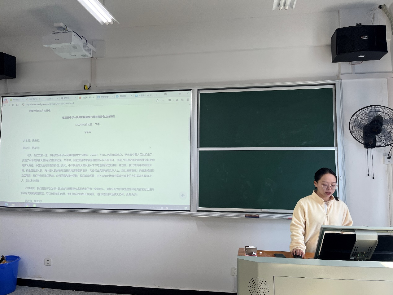 随后,观看了习近平在庆祝中华人民共和国成立75周年招待会上的讲话,学生党员何英杰表示:“通过这次讲话,我们可以感受到中国在新时代继续推进现代化建设的决心和信心。这不仅是对历史的回顾,更是对未来的展望,激励着全国人民为实现中华民族伟大复兴而不懈努力