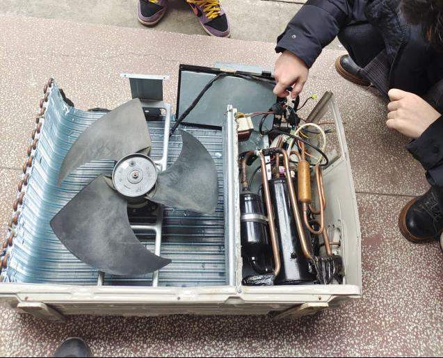 第一周的带领同学们了解空调的零部件,要求同学们能对空调进行拆卸与安装。在实验室曾智老师的带领下,19级建环专业的同学们在北校区第三教学楼一层设备室批次进行了空调的拆卸与安装工作,面对陌生又熟悉的零部件,同学们从生疏到熟练的上螺丝、整理零件,在实践中对空调内外机的结构与功能有了深入的认识。