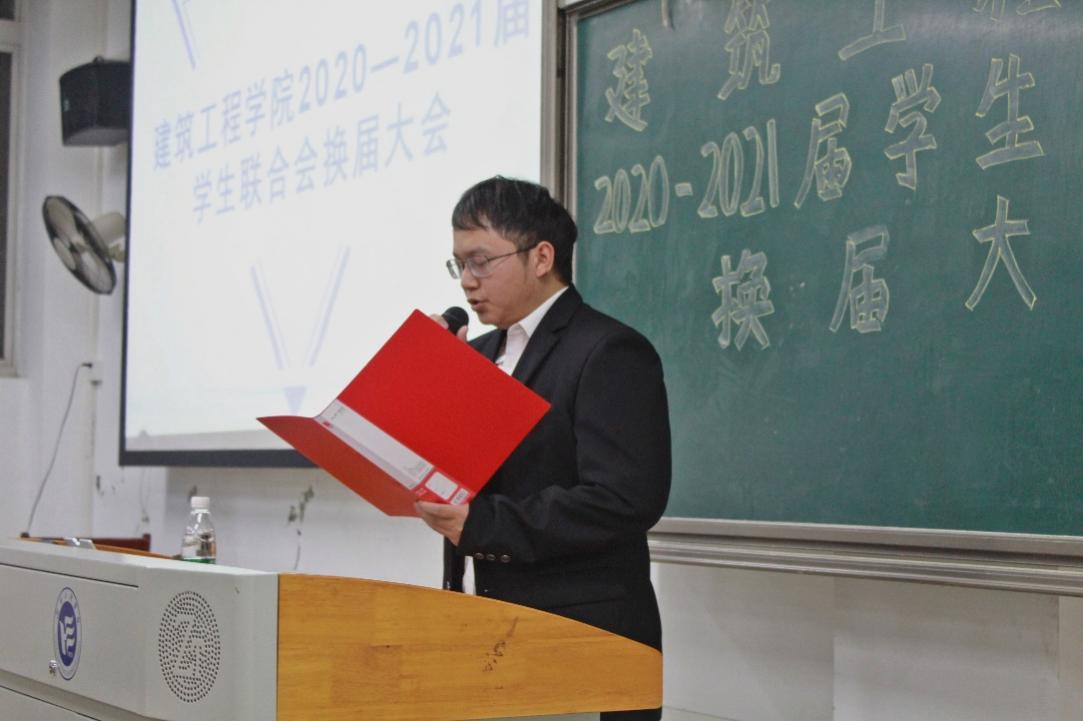 大会在建筑工程学院2020—2021届团总支副书记湛旺兴的演讲中拉开帷幕,他总结了去年学生联合组织工作的开展情况,分享了自己的感受和经验,并号召所有成员把学生联合组织建设得更好。