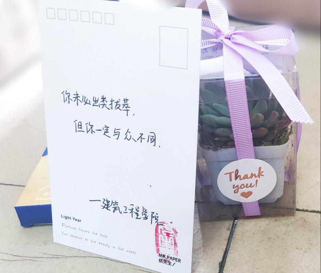 “你是女生你做主,愿你跟随梦想旋律,尽享快乐岁月”、“花样年华,飞扬姿采,绚烂青春,自由自在”、“青春活力魅力绽,英姿飒爽尽开颜”、“愿你今后的每一天都闪闪发光”...一句句祝福语被撰写在精美的明信片上,随着一盆盆多肉传递到2138CC太阳集团的女生手上,一份小小的心意,蕴含浓浓的真情。