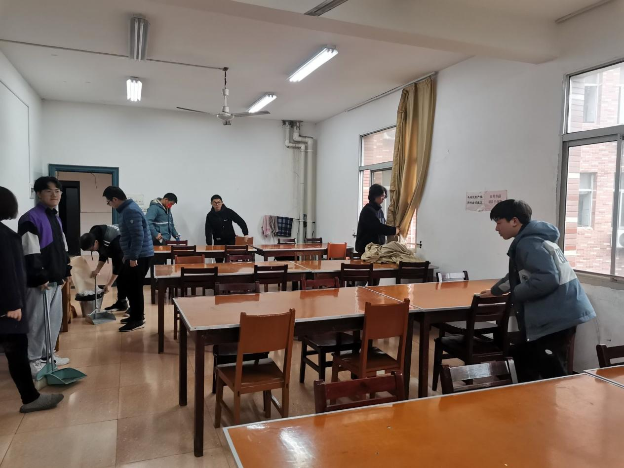 3月25日中午,建筑工程学院学生党员在谭杰老师的组织下对滨江3栋2楼自习室进行了全面的大扫除和消毒。