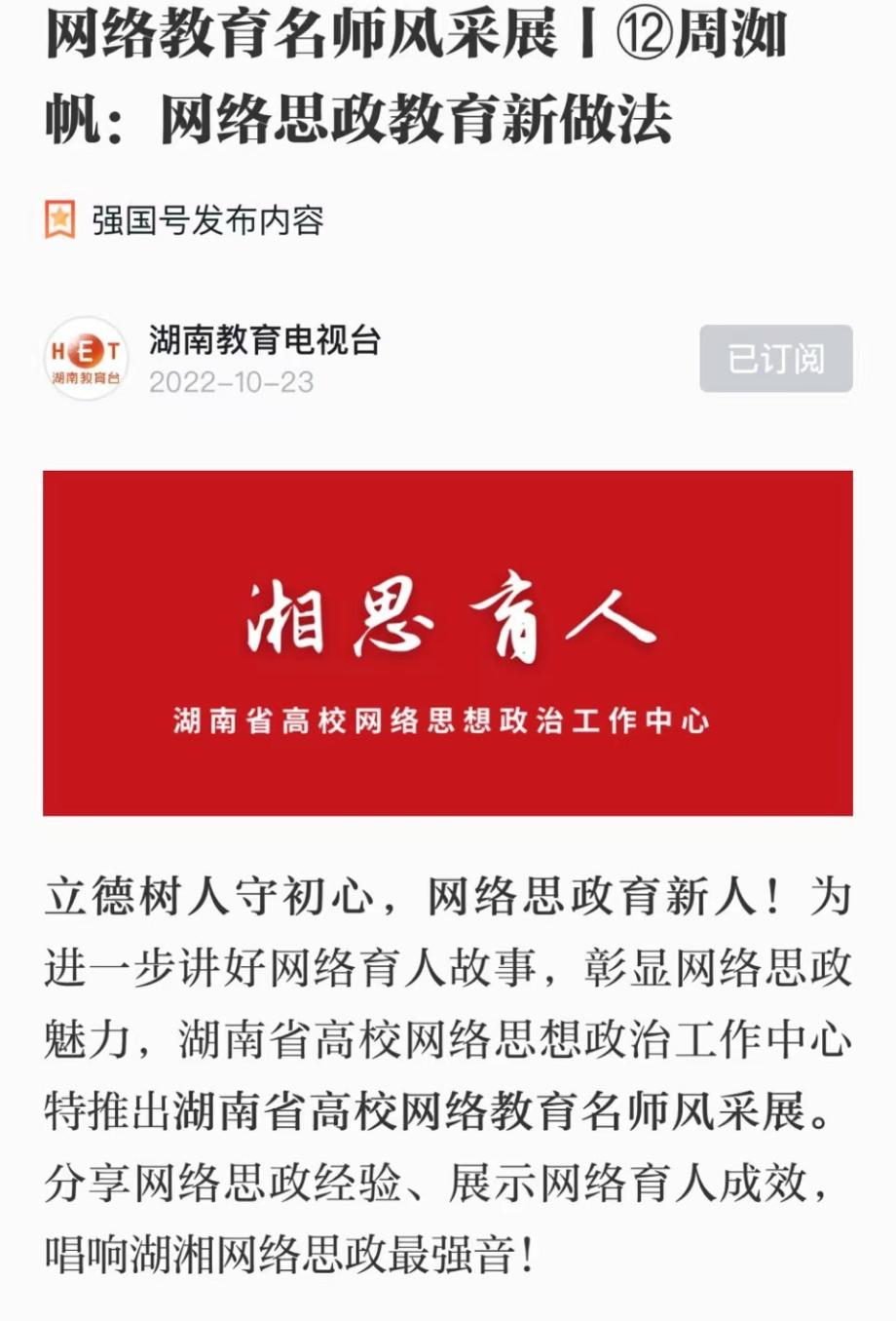 周洳帆任2138CC太阳集团团总支书记、易班工作站指导老师,2021年11月入选湖南省第二批网络教育名师培育计划。一直以来,周洳帆以“做青年学生的同心同路人”为初心和目标,建立“帆帆不会烦”网络名师工作室,借助微信公众号、视频号、微博、抖音等平台,利用亲和力表达,制作贴近大学生特点的网络作品,采用大学生喜爱的方式开展思想政治教育。她在新媒体平台开设了“大学生活指南”“我的大学故事”“睡前碎碎念”“小周老师的悄悄话”等栏目,粉丝覆盖校内师生、毕业校友、学生家长以及校外各界人士,充分发挥新媒体平台在引领学生思想、服务学生成长等方面的作用,让思想政治教育打破时间、空间局限,随时随地可翻看,做到“时时可育人、处处皆课堂”。