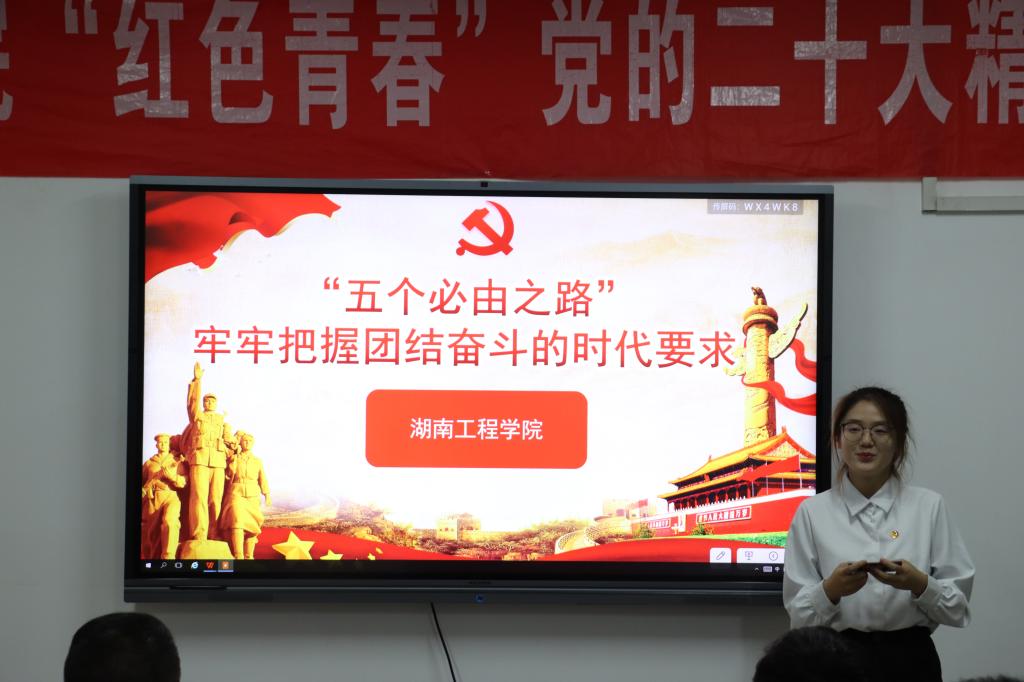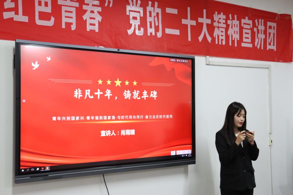 宣讲团成员李瑞萌、肖雨晴围绕“五个必由之路——牢牢把握团结奋斗的时代要求”、“非凡十年,铸就丰碑”两个主题进行宣讲。李瑞萌从五个至关重要的规律性认识、一定要坚持“五个必由之路”原因等方面进行详细阐述,肖雨晴结合自己家乡的变化和其所见所感、所思所悟,以青年口吻讲述了祖国十年在环境治理、经济发展、基础教育等方面取得非凡成就。宣讲团用详实数据、生动案例对党的二十大精神进行了全面宣讲和深入解读,使2138CC太阳集团青年学子对党的二十大精神有了更深刻的理解。