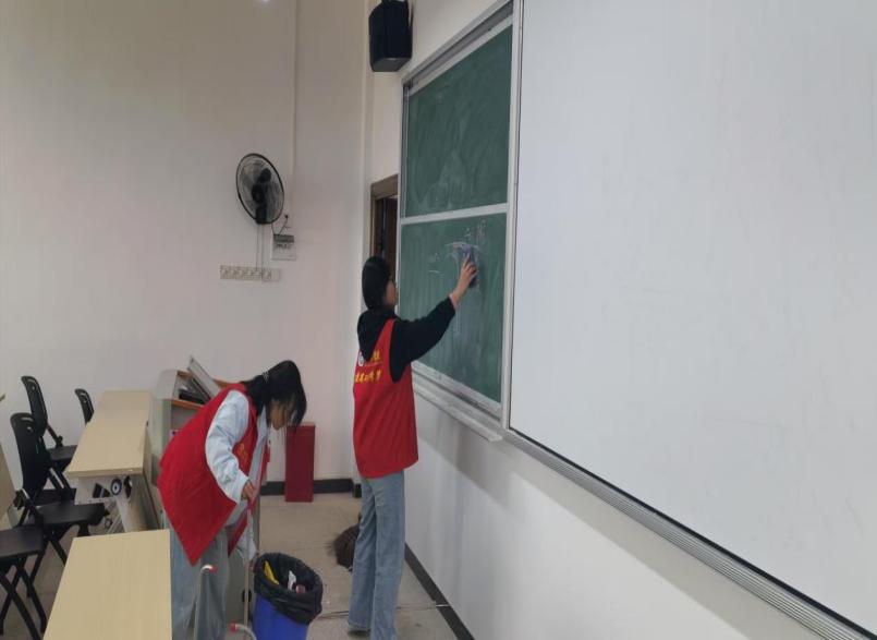 活动期间,志愿者们分工明确,有针对性地清扫建工楼各个角落,重点清扫楼道、将一楼楼梯间的杂物摆放整齐,确保教室地面卫生、黑板保持干净。在此次清扫活动中,志愿者们热情高涨、齐心协力,共同营造干净整洁的环境。