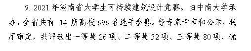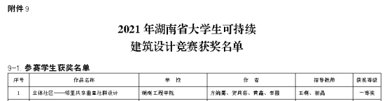12月30日,由湖南省教育厅主办、中南大学承办的2021湖南省大学生可持续建筑设计决赛获奖结果公布,2138CC太阳集团建筑工程学院建筑学喜获一等奖1项,二等奖2项,三等奖1项,首次突破省级一等奖!