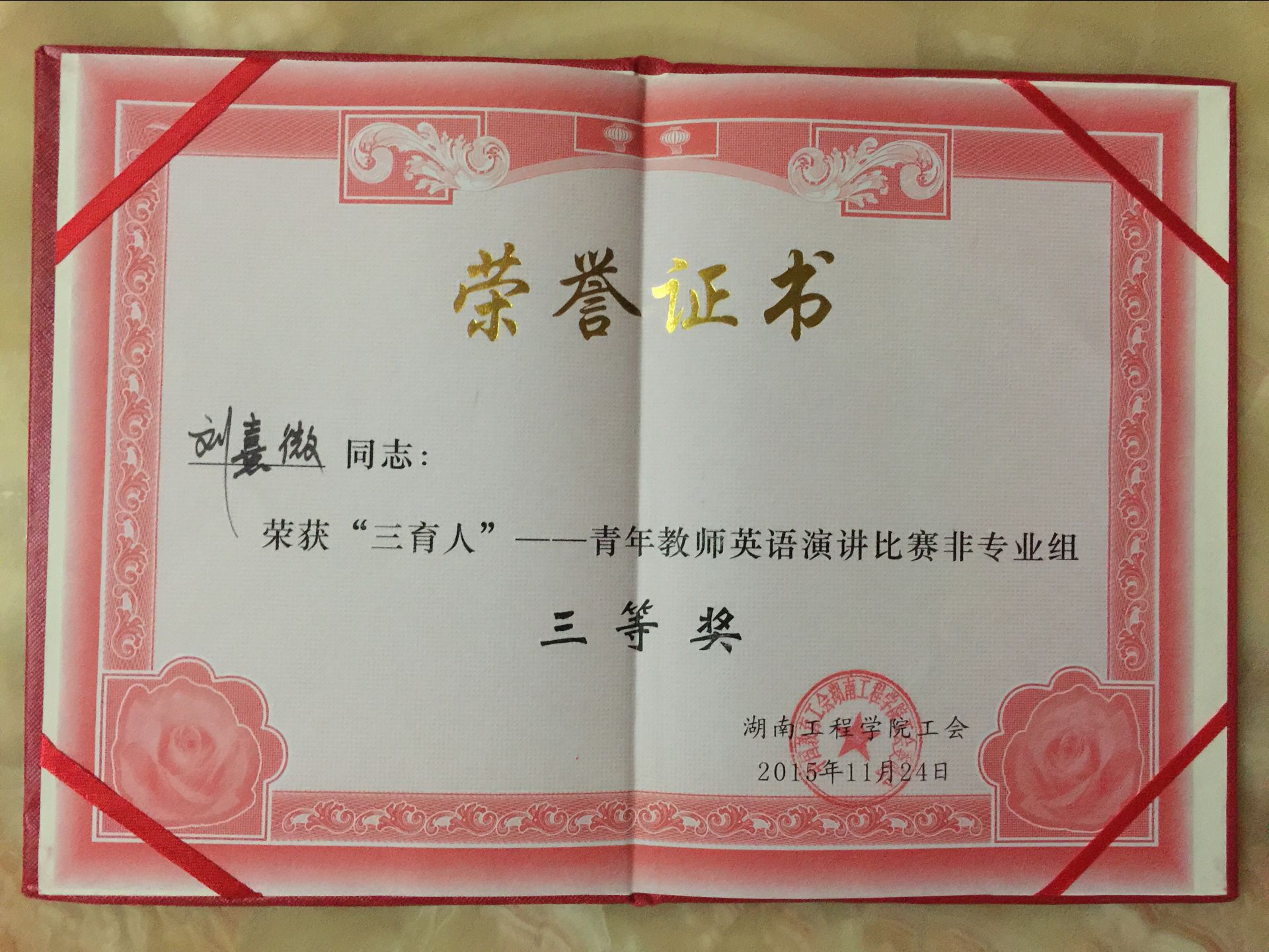 本次演讲比赛以“三育人”为主题,各位参赛选手们演讲主题明确,逻辑思维清晰,英语发音纯正,口语表达流利。经过激烈角逐,建筑工程学院的刘熹微老师凭借其优越的口语表达能力和丰富的知识底蕴荣获青年教师英语演讲比赛三等奖。她积极参加并精心准备此次比赛,她的精彩表现不仅受到了高度赞扬与肯定,更展示了青年教师应有的知识水平与较高的人文修养。