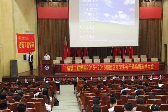 2015年10月24日晚6点,建筑工程学院于图书馆一号报告厅召开2015-2016届团总支学生会干部换届选举大会,出席此次会议的有学生办公室主任李佳老师、建筑工程学院团总支学生会主席团全体成员、参加竞选的干部干事以及全体大一新生。