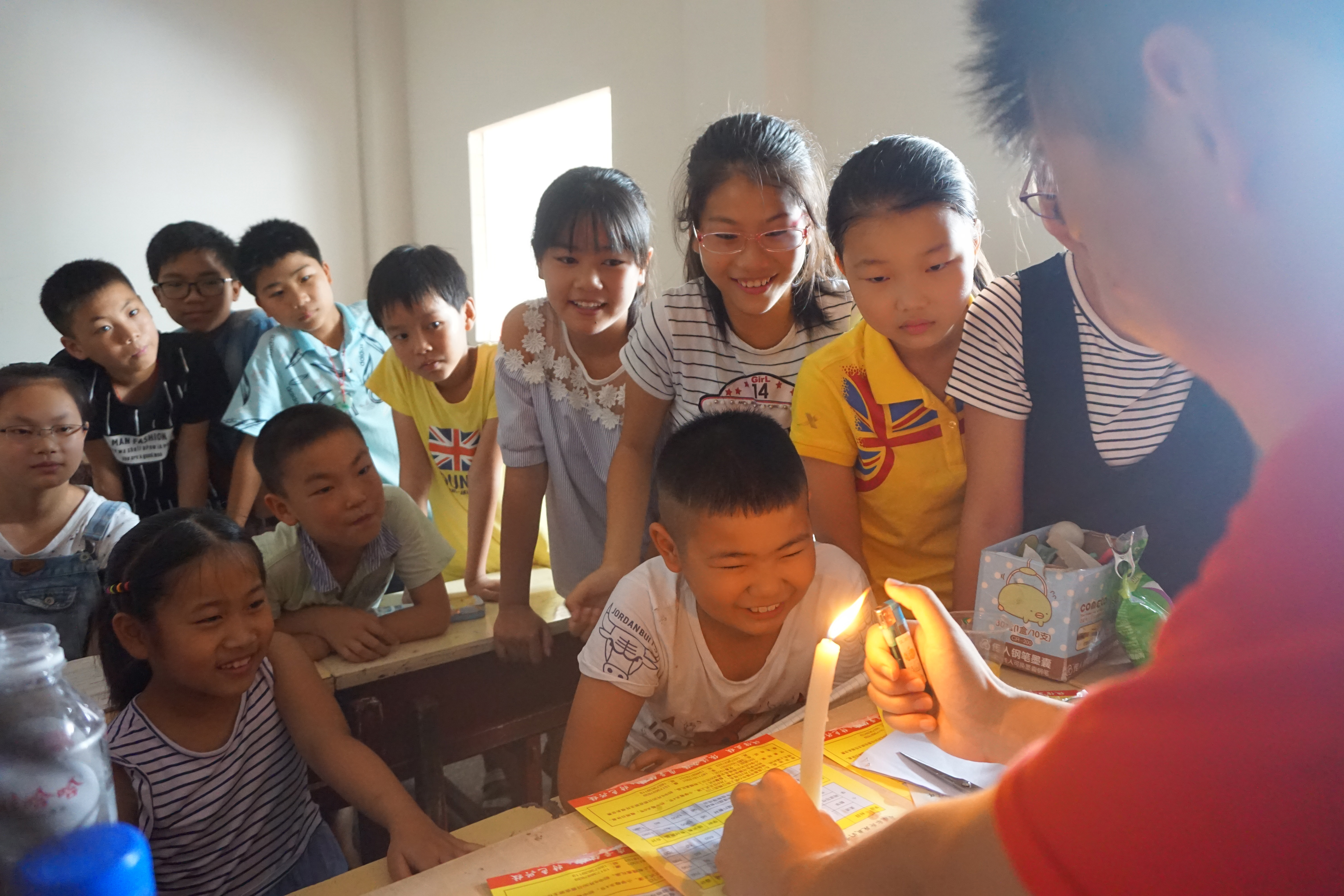 今天支教组面对的是教室里的四十多个小孩,在其中,他们有的来自初中,有的来自小学。突然到来的几个志愿者让这一教室的四十多个小孩略难为情,最开始他们大多拘谨地坐着,等待新“老师”的授课。为了拓宽当地中小学生的视野,增强其动手动脑能力,引入当代发达地区学子所接受的新式教育模式,教育关爱服务团早已准备了诸多新奇课程。其中,物理实验课吹响了冲锋的号角,成为了教育关爱服务团在此次实践活动中的第一堂课。对于许多没有接触过物理,不知物理为何物的同学们来说,物理实验对其有着莫大的吸引力。志愿者通过鸡蛋在清水和盐水中的浮沉现象、如何通过物理小知识区分生熟鸡蛋、将熄灭的蜡烛“隔空”点燃和点不燃的手帕这四个简单而有趣的物理实验,为小朋友们打开了一扇通往物理世界的大门。随着课程的进行,小朋友们由最开始的拘谨而羞涩渐渐变得活泼起来,争相回答问题,还提出质疑。在志愿者表示他们可以上前观察实验结果后,小朋友们立刻簇拥着讲台,观察这神奇的一幕。