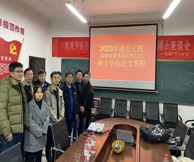 12月18日下午,建筑工程学院在院会议室举行2020届硕士学位论文答辩会。共有4位动力工程新能源技术及应用方向的研究生参加答辩。这4位同学的学位论文依托绿色低碳建筑节能与材料技术湖南省工程研究中心及多项省级科研项目完成,研究内容涉及建筑节能和可再生能源利用技术,共发表论文7篇(其中SCI论文3篇),获得实用新型专利授权5项,申请发明专利9项。